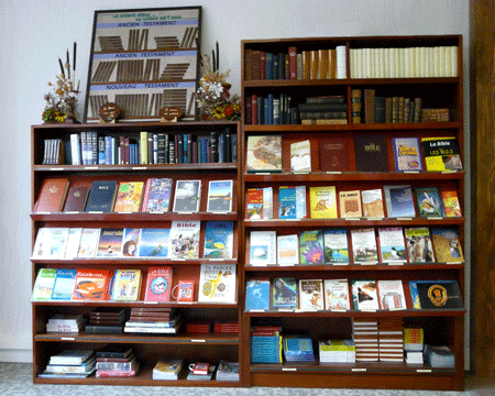 Le rayon librairie biblique propose un certain nombre de Bibles en différentes versions, L'on trouve également des Bibles avec texte adapté aux enfants, des Bibles (texte intégral) Un grand choix de Bibles en diverses langues étrangères est disponible, D'autre part, étant en contact avec trois grands éditeurs bibliques, nous pouvons obtenir,